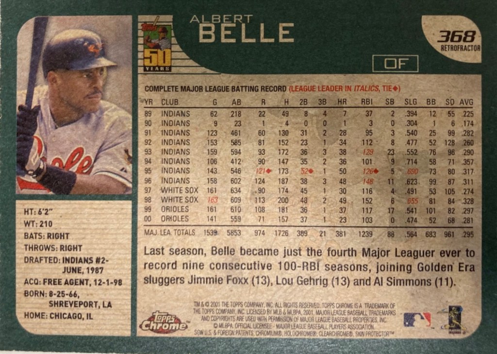 Take a look at the back of this 2001 Topps Chrome card. That’s right, in 2000–on the verge of retirement from osteoarthritis in his hips— Albert Belle became just the fourth player in MLB history to do it. The only others? Just a couple of names you might’ve heard: