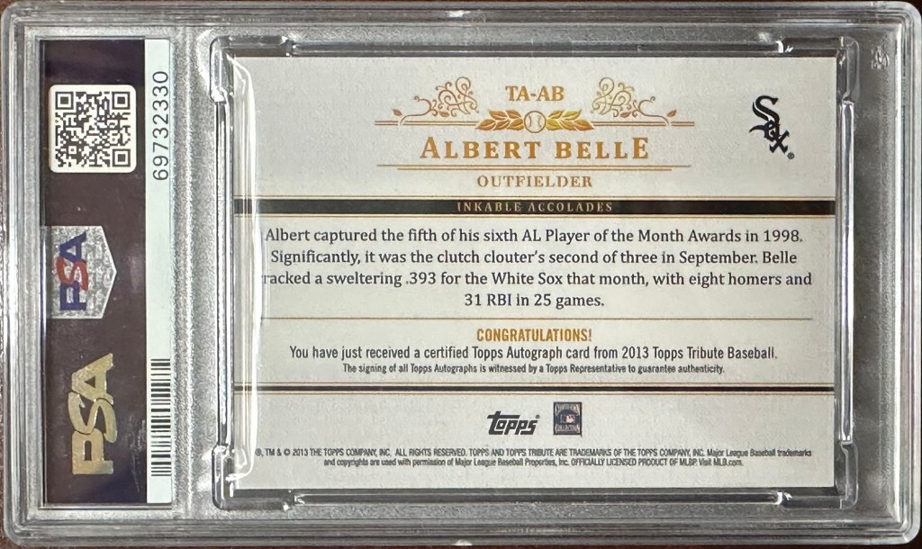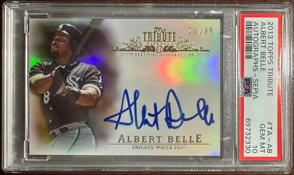 From the 2013 Topps Tribute Autographs Sepia parallel, this on-card auto of Albert Belle bridges modern ultra-premium design with classic Tribute branding—featuring gold foil, sepia tint, and thick cardstock reminiscent of museum-quality slabs.
