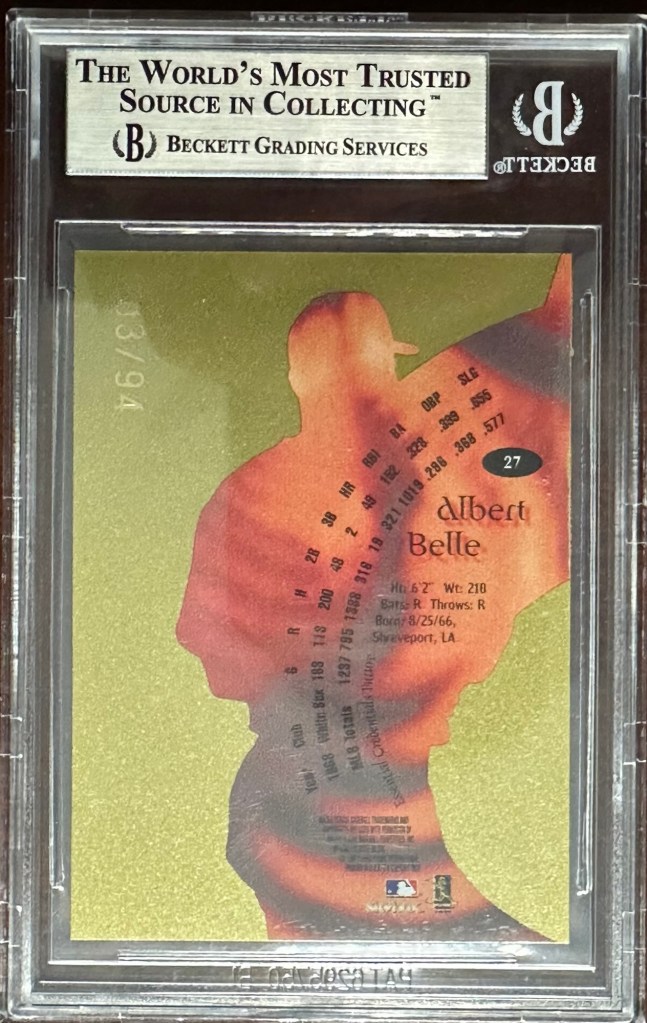 One of the rarest and most striking cards from Belle’s late-career run with the Orioles. This 1999 Essential Credentials Future is serial numbered 03/94 and features the signature gold holofoil finish of the 1999 E-X Century set. The design is pure late-’90s fire—bold, experimental, and layered with texture and shine.