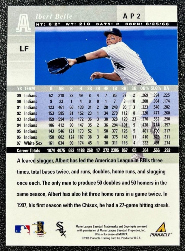 A feared slugger, Albert has led the American League in RBIs three times, total bases twice, and runs, doubles, home runs, and slugging once each. The only man to produce 50 doubles and 50 homers in the same season, Albert has also hit three home runs in a game twice. In 1997, his first season with the Chisox, he had a 27-game hitting streak.