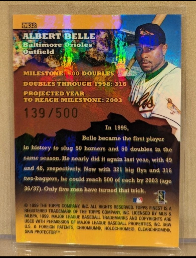 In 1995, Belle became the first player in history to slug 50 homers and 50 doubles in the same season. He nearly did it again last year, with 49 and 48, respectively. Now with 321 big flys and 316 two-baggers, he could reach 500 of each by 2003 (age 36/37). Only five men have turned that trick.